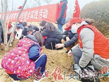 3月12日上午,市游园管理站党员志愿者带领市育敏学校部分学生,在殷墟玉兰园开展玉兰节游赏活动和栽植迎春花小苗活动。活动中,党员志愿者给孩子们讲解了玉兰花的相关知识,教他们认识苗木,还专门准备了迎春花小苗,带领孩子们一起栽植,提高孩子的动手能力。图为活动现场。 (刘乃宁 摄)