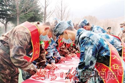 3月15日,林州市举行2021年春季应征入伍新兵欢送仪式,101名优秀青年身穿崭新的迷彩服,胸戴大红花,肩披红绶带,怀着报效祖国的赤诚之心,精神抖擞地踏上新征程,步入绿色军营。图为入伍新兵在写有“传承弘扬红旗渠精神 争做新时代出彩林州兵”的条幅上签名。(李崖琪 摄)