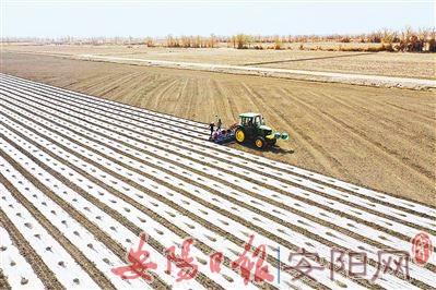 在新疆尉犁县塔里木乡英努尔村,农民驾驶大马力拖拉机在棉田里进行铺膜作业(3月28日摄)。