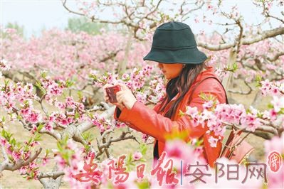 4月11日,游客在沧县大运河畔千亩桃花园中拍照。