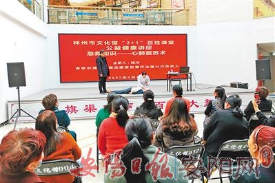 4月7日下午,林州市文化馆举办了“3+1”百姓课堂公益健康讲座,邀请省级非遗项目陈氏痘疹伤寒疗法的传承人陈金州和陈冲,为大家讲解中老年人保健知识和心肺复苏急救知识,并现场演示急救方法。(岳用丽 摄)