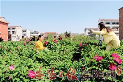 4月14日,众多游客来到姚村镇龙泉庄村欣赏牡丹。近年,该村全力打造美丽乡村,拆除残垣断壁、违建20余座,打造绿地街景10余处,在村南种植4000余株牡丹打造了牡丹园。每年春天,牡丹竞相绽放,吸引众多游客前来观赏。(本报记者 郭 荣 摄)
