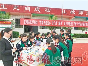 4月23日是“世界读书日”。当天下午,安阳市长垣商会在殷都区许家沟乡东子针小学举办“书香传递爱心 知识放飞梦想”图书捐赠暨读书节活动。本次活动捐赠的科学知识、少年经典文学、国学精粹及教辅类图书价值2万余元。(冯文亮 摄)
