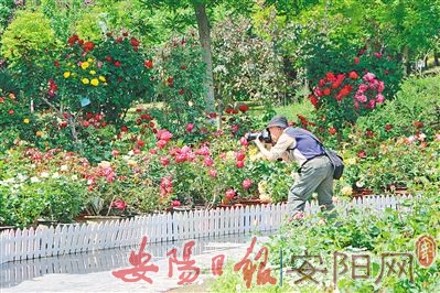 图为4月29日,市民在布展好的月季花旁拍照。(本报记者 王都君 摄)