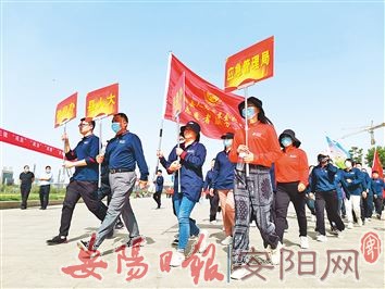 5月8日,全国第六届“万步有约”健走激励大赛安阳县(示范区)启动仪式在礼湖公园广场举行。41个县直机关单位644位在职人员参加了活动。大赛为期100天,从11日起,参赛队员将佩戴专用计步器,记录每天的健走数据,上传至活动网络主页,通过累计积分进行评比。据悉,随着“万步有约”活动的推进,全县参与人数不断增长,参赛规模不断扩大,大部分参赛人员养成了“日行万步”的健康生活习惯,科学健走蔚然成风。图为启动仪式现场,参赛队员健步走。(本报记者 郝亚伟 摄)