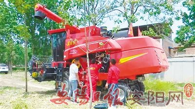 小麦尚未成熟,备战“三夏”工作已拉开序幕。连日来,县农机部门组成农机检修服务队,深入农机户家中,提供农机具保养、调试、检修一条龙服务,从源头降低农机故障率,全力备战“三夏”生产。图为5月10日,农机检修人员正在老店镇耿范村检修联合收割机。(赵志刚 摄)