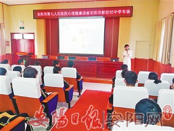 本报讯 (记者 朱亚芳) 为进一步加强儿童青少年心理健康工作,促进儿童青少年心理健康和全面素质发展,5月12日下午,市第七人民医院心理专家走进市新世纪中学,开展青少年心理健康教育专场讲座。通过专业心理治疗师的授课,让广大师生认识到心理健康的重要性。