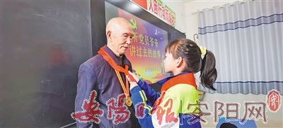 近日,县人社局驻湘河店村第一书记袁征邀请84岁的抗美援朝退伍老兵、有60年党龄的老党员韩学林,到湘河店村小学,给同学们上了一堂特殊的思政课。图为少先队员为韩学林佩戴红领巾。 (本报记者 郝亚伟 摄)