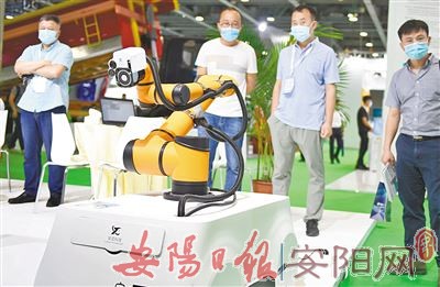 5月25日,客商在2021广州国际汽车技术展览会上观看一台汽车充电机器人演示自动充电。