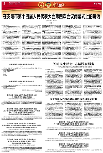 安阳市第十四届人民代表大会第四次会议听取和审议了徐家平主任所作的《安阳市人民代表大会常务委员会工作报告》。会议充分肯定了市人大常委会自市十四届人大三次会议以来所做的工作,同意报告提出的今年主要任务,决定批准这个报告。