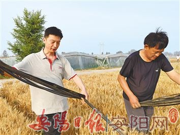 内黄县东庄镇聚焦解决群众“急难愁盼”问题,组织人员深入农家灶头、田间地头,察民情访民意,帮助群众夏收夏种夏管。图为6月9日,河南省委外事工作委员会办公室对外发展合作处副处长、东庄镇东街村党支部第一书记王磊(左)走进麦田,与村民一起盘起节水滴灌管,方便农机收割。(李连方 摄)