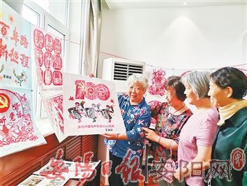 北关区豆腐营街道新村社区联合市无线电管理局、市老干局银龄志愿队举办“喜迎建党一百载、剪纸传承忆初心”作品展,通过一幅幅剪纸作品,表达对祖国的热爱之情,祝愿祖国更加美好!图为昨天,我市一名剪纸爱好者向观众展示其作品。 (王 艳 摄)