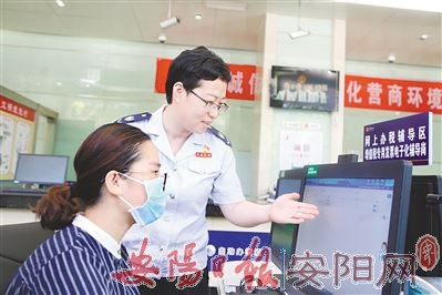 国家税务总局安阳高新区税务局认真落实“我为纳税人缴费人办实事”六大攻坚措施,积极发挥党员先锋岗作用,大力推广退税(费)网上申请,减少纸质资料传递,实现退税全流程电子化,降低纳税人办税成本,加快退税(费)资金到账。图为6月4日,该局纳税辅导员、共产党员田艳(右)在辅导纳税人网上办理出口退税发票业务。(毕兴世 摄)
