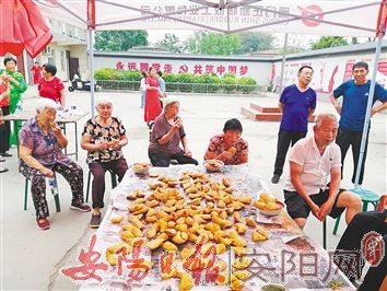为弘扬敬老爱老优良传统,增强村民的幸福感,6月14日,殷都区北蒙街道东大姓村邀请村里350多位老年人一起过端午节。活动现场,志愿者和村民一起动手和面、炸菜角、做鸡蛋汤等,忙得不亦乐乎。时间不长,60多公斤香喷喷的粽子飘出香味。旗袍队、腰鼓队表演了精彩节目,赢得老人们的阵阵掌声。(本报记者 肖敬光 摄)