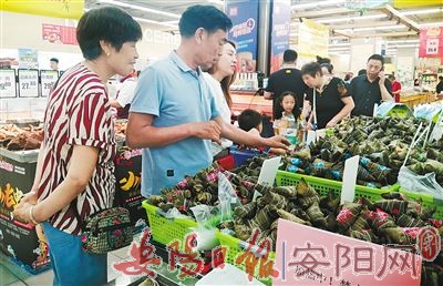 在中华路与迎春东街交叉口附近的一家超市内,购买粽子的市民络绎不绝。与往年一样,超市专门为粽子开辟了一方天地,并安排专门的导购员负责推介。豆沙粽、腊肉粽、板栗粽……各种口味的粽子悉数亮相。除常见口味外,一些品牌还推出水果粽、香芋粽、八宝粽等口味,记者数了一下,约有30种口味。除此之外,商场还售卖现包的粽子,加热之后,顾客可以立即品尝到美味。