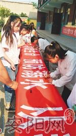 为加强校园安全教育,安阳县韩陵镇李家山小学开展了防溺水主题班会等系列防溺水安全教育活动。图为6月11日,该校师生在条幅上签名。(华飞飞 摄)