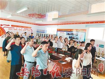作为安阳市首批中小学党建示范校,在党史学习教育中,龙安区第二初级中学党支部以党建与教学有机融合为核心,找准党建工作与教育教学工作的结合点,积极开展工作,有力促进了学校全面发展。图为6月11日,该校全体党员过集体“政治生日”,举行新党员接收和老党员重温入党誓词仪式。(常上书 摄)