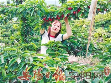 近年,牛屯镇积极推进农业产业结构调整,鼓励村民种植樱桃、三樱椒等特色经济作物,促进乡村振兴。眼下,该镇李建村村民王永士的果园里樱桃挂满枝头,每天前来采摘的游客络绎不绝,日销量2500余公斤。(肖博文 摄)