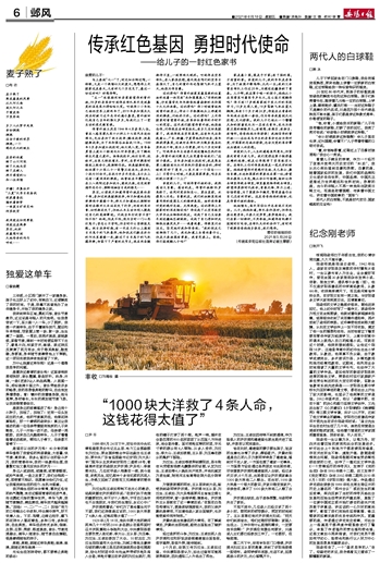 还记得吗?你曾外祖家里最显眼的位置始终放着一块写有“共和国奠基人”字样的牌匾,沙发靠背处年年都张贴着崭新的共和国十大元帅画像。还记得吗?你小时候曾经爬到曾外祖身上,伸出小手抚摸他头上那道深深的弹痕,问他疼不疼。还记得吗?上次你探家时看望曾外祖,老革命拉着你的手时开心的笑容。这次我们探望你曾外祖,他很挂念你,问你现在在哪里驻扎,有多久没回来探家了。我说你现在空军某部,这些年先后奔赴唐山、广东、新疆、宁夏等地执行任务,每年都获得嘉奖,还被所在部队评为服务基层优秀机关干部,因为工作需要,好几个月没回家了。听说你去年主动要求到边彊地区执行任务,你曾外祖沉默良久后笑着告诉我们:“这孩子像我。当年参加渡江战役时,我是乘坐第二艘船到长江对岸执行侦查任务的,那时候就写好了遗书,心里只有一个信念——上!不管什么时候,只要是国家需要,咱当兵的就必须第一个上!”