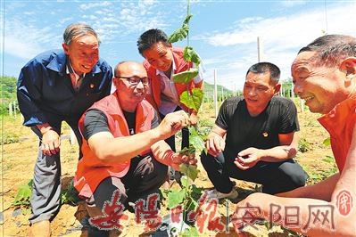 林州市东岗镇八角村独特的山地气候与土质条件,让瓜蒌成为农民脱贫致富的“金钥匙”。在该村党支部书记、村委会主任、合作社负责人韩常青带领下,通过土地流转、租赁,承包了常年外出打工村民几乎撂荒的数十公顷山地、坡地,全部种植瓜蒌。图为6月19日,在八角村八角杏花农民专业合作社瓜蒌种植基地,农技人员王海军(左二)对瓜蒌“掐尖打顶”等夏季管理技术进行指导。(毕兴世 摄)