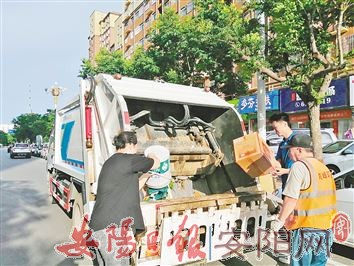 “垃圾不落地,汤阴更美丽。谢谢大家对汤阴环卫事业的支持……”7月1日上午,在汤阴县文博街上,随着车上滚动播放的提示音,深圳剑峰集团安阳分公司一辆垃圾收集车停在路边,附近路段的环卫工人将刚刚清理的垃圾倒入车里,沿街商户习惯性地拎起门店内的垃圾筐,将垃圾投入车内。