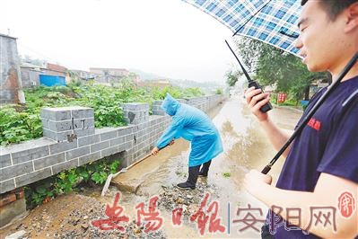 殷都区都里镇是2016年“7·19”特大暴雨洪灾受灾最严重的地区。今年7月,该镇100余名干部全部到防汛一线督导防汛工作,提前准备物资,配备钩机、铲车、锣鼓等,做好防汛应急准备工作。各村党员干部加紧巡查河道、排查危房,转移老人,确保无一人伤亡,安全度过汛期。图为7月18日,防汛巡逻人员一边拓宽排水河道,一边向镇防汛指挥部汇报雨情。(毕兴世 摄)