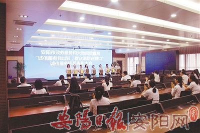 为弘扬诚信服务典型,提升政务服务效能,7月15日下午,市政务服务和大数据管理局组织全体政务大厅服务人员召开“诚信服务我出彩,文明服务在窗口”诚信服务标兵表彰大会,7名综合受理窗口人员和3名大厅导办人员获表彰。(徐潮旺 摄)