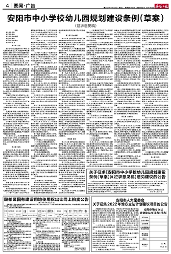 关于征求《安阳市中小学校幼儿园规划建设 条例(草案)》(征求意见稿)意见建议的公告