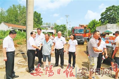 7月26日,安阳商都农商银行党委书记、董事长聂喜旺(左二)一行前往崔家桥镇、永和镇等受灾严重的乡镇看望慰问受灾群众,送去方便面、矿泉水、消毒液等物资。该行党委班子成员分别深入受灾企业,仔细查看受灾情况,详细询问复工存在的困难,及时送上金融服务。(陶 涛 摄)