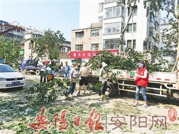 市园林绿化中心共出动950余人次、机械车辆75辆,扶正、清理修剪树木830棵。各区园林绿化部门共出动464人次、机械车辆49辆,已扶正、清理树木1450棵。图为8月1日,工作人员在清理树枝。(本报记者 王都君 摄)