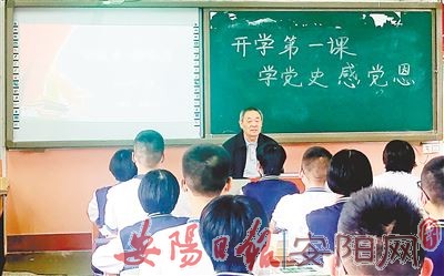 9月1日,滑县第二高级中学高三学子迎来新学年开学第一天并开展了丰富多彩的“开学第一课”活动。有的班级邀请老党员为学生上党课、讲党史,有的班级邀请优秀大学生志愿者讲述防汛抢险经历,有的班级举行“听党话、跟党走”演讲比赛,用特别的方式开启新学年。图为滑县人大常委会原副主任冯令标为学生讲党史故事。(赵晓伟 摄)