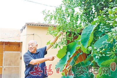 王庄镇大力实施农村庭院、荒宅院落、房前屋后等宅荒区域的绿化工作,引导村民种植苹果、丝瓜、南瓜等瓜果蔬菜。碧绿的叶子、鲜艳的花朵、丰硕的果实,不仅绿化、美化了环境,还丰富了群众的日常生活。图为8月31日,该镇龙村原党支部书记董存山喜看宅院的水果丰收。 (王 圣 摄)