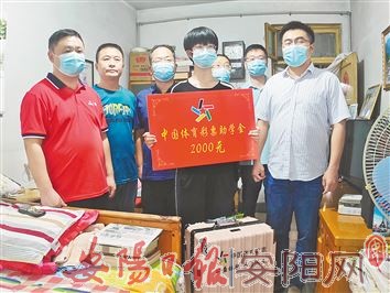 本报讯  9月3日,河南体彩安阳分中心主任张付国与安阳市财政局、共青团安阳市委、部分街道办事处等相关领导一行人,给困难家庭学子送去了2000元的助学金和学习生活用品。