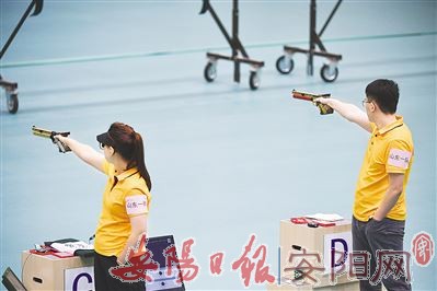 当日,在西安举行的第十四届全运会射击10米气手枪混合团体决赛中,山东一队选手张梦雪/张博文以16比10的比分战胜浙江一队选手冯思璇/刘军辉,夺得冠军。(新华社记者 张博文 摄)