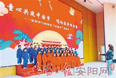 为了培养学生的爱国之情,9月27日,安阳市飞翔学校一年级开展了“童心共筑中国梦 唱响国歌颂祖国”唱诵会。学生精心准备、认真排练,每一句歌词都体现了他们的爱国、爱党之情,展示了朝气蓬勃、昂扬向上的精神面貌。(本报记者 任玉霞 摄)