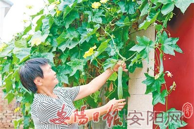 王庄镇龙村鼓励引导村民利用房前屋后等宅荒区域种植丝瓜、南瓜等蔬菜,不仅绿化美化了环境,还丰富了群众“菜篮子”。图为10月3日,龙村村民在庭院收获新鲜丝瓜。(王 圣 摄)