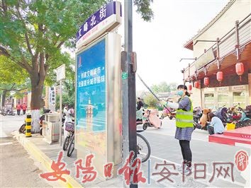 时而弯腰拿起刷子沾着油漆涂刷灯杆的下端,时而又拿起绑着长杆的工具涂刷灯杆的上半部。10月29日,记者在文峰北街见到市亮化照明事务中心的工作人员正在沿街油漆灯杆,维护照明设施。