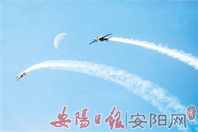 开幕式结束后,10位跳伞队员离开座舱,一跃而下,拉开了本次大会特技飞行表演的序幕。超低空倒飞通场、双机对冲、双机开花……两位中国飞行员驾驶XA42无限制级特技飞机默契配合,赢得了现场观众的一次次喝彩。动力伞、三角翼、直升机等共50余架航空器在古都安阳蓝天上演“速度与激情”。