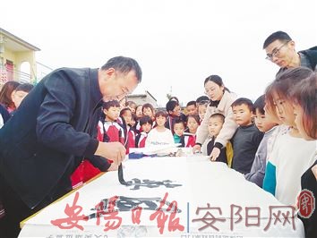 11月1日,区文联到马投涧镇上毛仪涧村小学开展书法家进校园暨师生同写活动。我市书法家苏中州、孟令金、安东、靳卫国现场创作书法作品,让大家近距离感受到了书法的魅力。(本报记者 申 昕 摄)