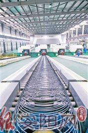 生产车间内一盘盘直径1米左右、1.2米高的“光圆”钢筋从自动上料机经过轧制、热处理、吐丝,一条条明光锃亮的高强带肋钢筋被生产出来。“这是行业首创的第七代生产线,轧制速度1000米/分钟,是目前世界上冷轧速度最快的冷轧带肋钢筋生产线。”翟文自豪地说。用这条生产线生产钢筋,整个过程只用电,没有废水、废气的排放,属于清洁生产,而且钢材节材率达到20%,制造成本也相对较低。也就是说,同一座建筑,等强度代换,以前要用1000吨钢材,现在只用800吨。