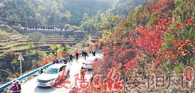 深秋时节,太行山多处山岭呈现层林尽染的美景,游客纷纷登山健身,观赏红叶。图为11月6日,游客在石板岩镇韩家洼村一带赏红叶。(本报记者 刘剑昆 摄)