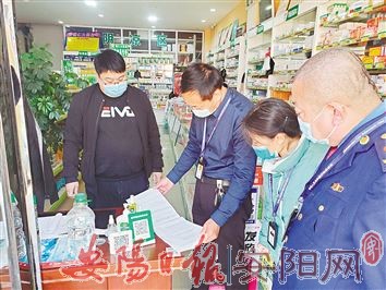 为确保药店疫情防控监管到位,11月12日,县市场监管局出动执法人员178人,对全县79家零售药店是否严格按照疫情防控措施落实戴口罩、测体温、消毒、扫行程码、登记等各项制度进行拉网式、不间断、无死角监督检查。经过检查,15家疫情防控不到位的零售药店被责令停业整顿。图为检查现场。 (本报记者 郝亚伟 摄)