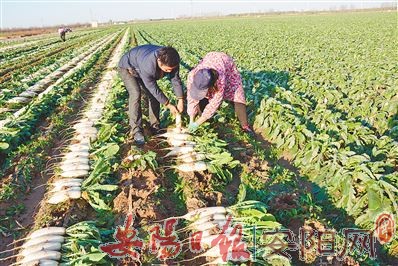 11月15日,马上乡郭庄村村民正在拔白玉萝卜,准备装车外运。近年,该村大力发展露地蔬菜产业,通过“党支部+合作社+农户”模式,引导村民种植胡萝卜、白萝卜、娃娃菜等蔬菜。目前,该村种植的约213.33公顷蔬菜喜获丰收。