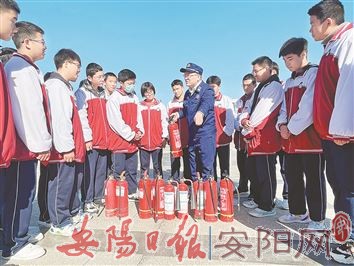 近日,安阳县消防救援大队宣传员走进安阳县实验中学,开展消防宣传进校园活动,向师生宣传普及消防安全常识。(本报记者 王倩 摄)