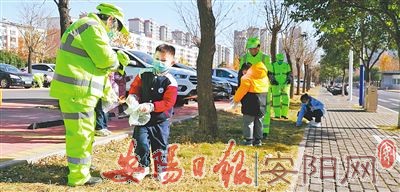 11月25日,林州市一家幼儿园的老师和幼儿开展关爱环卫工活动,为环卫工送去护手油,并一起捡拾垃圾。(本报记者 刘剑昆 摄)