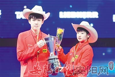 11月28日,孙颖莎(右)/王楚钦在颁奖仪式上手举冠军奖杯合影。