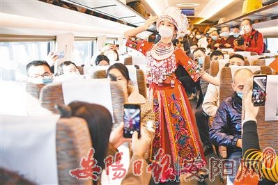12月6日,工作人员身着苗族服饰在首趟正式运营的张吉怀高铁列车上为乘客表演。