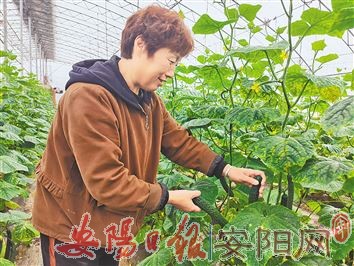 眼下,八里营镇刘苑村村民刘优军的大棚黄瓜进入采摘期,青翠欲滴的黄瓜挂满藤间,煞是喜人。图为12月14日,刘优军的妻子正在采摘黄瓜。