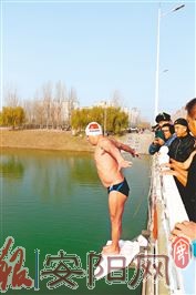 虽然当天中午阳光较好,但户外温度在10℃以下,安阳河的水温则更低。围观的市民穿着羽绒服,而这群冬泳跳水爱好者却穿着泳衣泳裤。虽然他们的平均年龄在50岁左右,但展现出的活力和精气神却一点儿也不输年轻人。