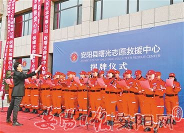 12月16日上午,安阳县(示范区)举行曙光志愿救援中心揭牌仪式。该救援中心是由热心公益救援事业的民营企业家、农民工等爱心人士组成的社会团体。自2018年筹建以来,该中心积极参与爱心公益服务,搜救走失人员150多名,参加各种大型活动安全维护20余次,举办救援知识培训80余场。今年夏季,该中心积极开展防汛救灾志愿服务,在全县抗洪抢险一线作出了突出贡献。图为揭牌仪式活动现场。 (本报记者 郝亚伟/文 楚国华/图)